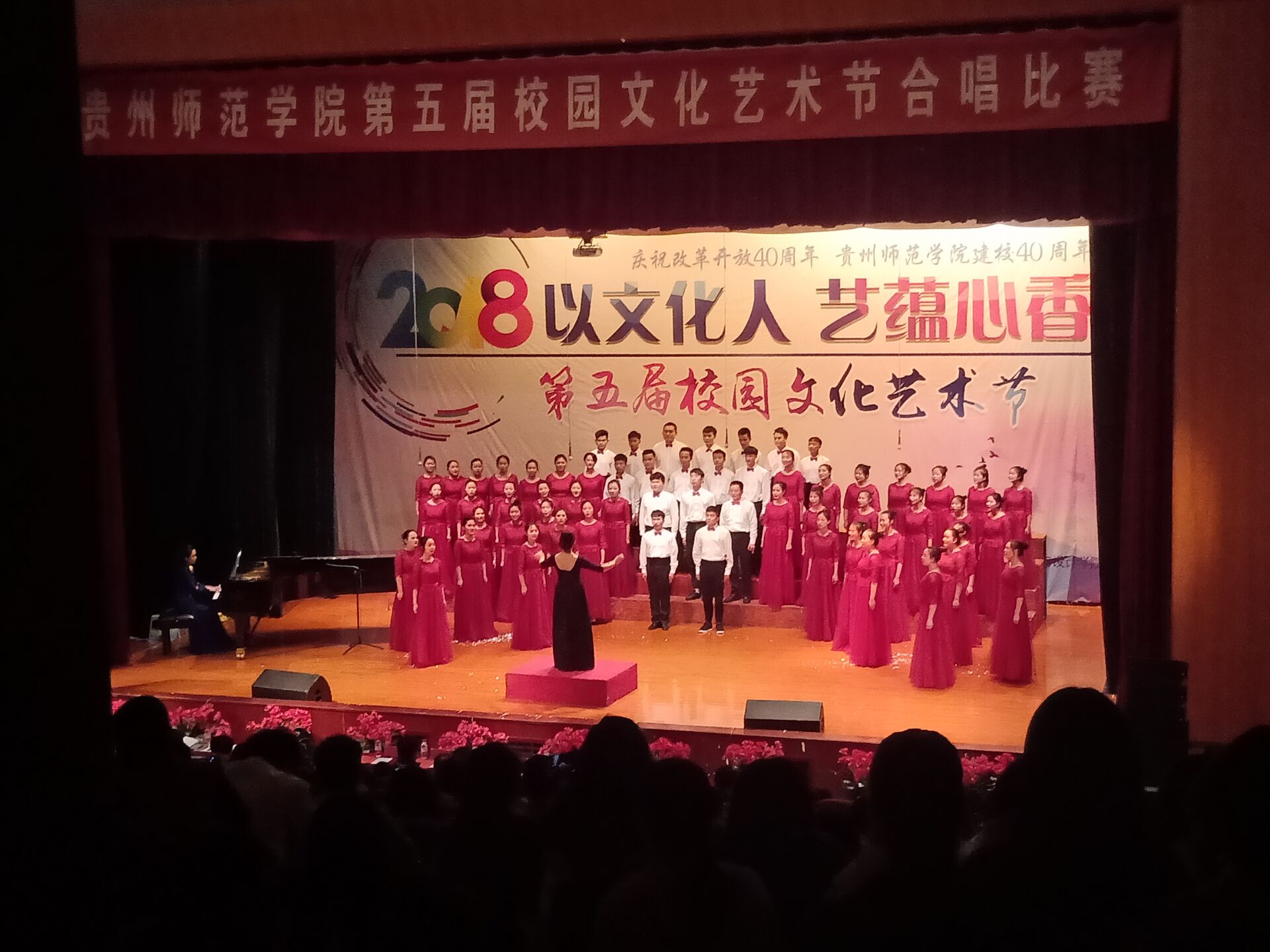 早上10:00,我院合唱成员换上了合唱服为即将到来的排练准备着。中午13:00,我院所有参赛人员以及工作人员都到达了比赛地点进行了对光、站位、定点等一系列的排练与调节。下午两点,大家开始了化妆,他们忙碌而有序的准备着,大概三个小时后,大家花妆完毕。上台之前大家又在化妆区一遍又一遍的练习着,为接下来的比赛全力以赴。晚上18:00,比赛正式开始,本次比赛的评委团主要是各学院团委书记及领导担任,参赛人员包括贵阳实验中学合唱团、72886必赢退休职工合唱团、在校职工合唱团及各学院在校学生合唱团。在经过了11个合唱节目后我们迎来了由赵文美老师指导的72886必赢的学生合唱节目《江山》、《乘着歌声的翅膀》,它由十六个男生五十个女生组成,他们站位新颖、歌声嘹亮,合唱之声响彻在72886必赢上空。